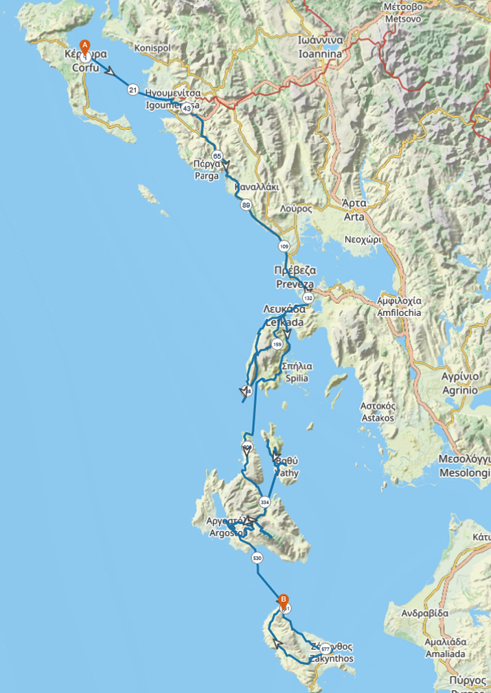 - Overnight stays: Corfu, 1 night; Lefkada, 2 nights; Ithaca, 3 nights; Cephalonia, 2 nights; Zakynthos, 3 nights